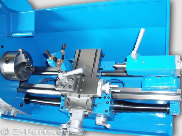 Ausgestattet mit Längsvorschub, Gewindeschneiden Metrisch und Zoll, Spindelabdeckung und Futterschutz, 4-fache Werkzeugaufnahme mit Klemmhebel einfach zum Wechseln, Oberschlitten drehbar mit Winkelskala zum Kurzkegeldrehen.