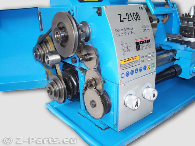 Eine Getriebe Drehbank / Drehmaschine mit 6 Geschwindigkeiten von 125 – 2000 U/min. Das Umschalten erfolgt durch Umlegen des Keilriemens. 230 Volt Motor, 550 Watt, Rechts/Links Lauf, NOT-AUS Schalter.